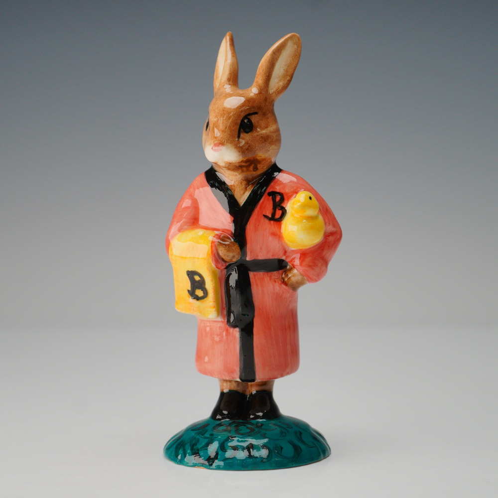 This charming figure depicts a brown rabbit standing on a textured green circular base, elegantly dressed in a coral-pink robe with black trim. Completing the scene is a yellow towel bearing a “B” draped over one arm, and a yellow rubber duck perched on the opposite shoulder. A matching black “B” monogram adorns the chest of the robe — a delightful detail that highlights the hand-painted craftsmanship typical of Bunnykins designs.